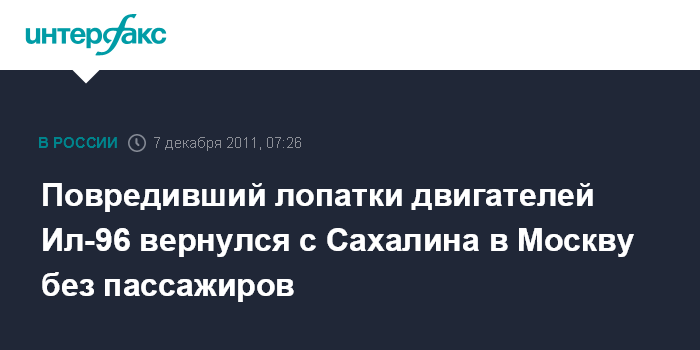 Южно-Сахалинск. 7 декабря. ИНТЕРФАКС-ДАЛЬНИЙ ВОСТОК - Самолет Ил-96 авиакомпании "Аэрофлот", прилетевший из Москвы в Южно-Сахалинск во вторник и повредивший лопатки трех двигателей, находится в столичном аэропорту "Шереметьево", сообщили агентству "Интерфакс-Дальний Восток" в пресс-службе аэропорта Южно-Сахалинска.