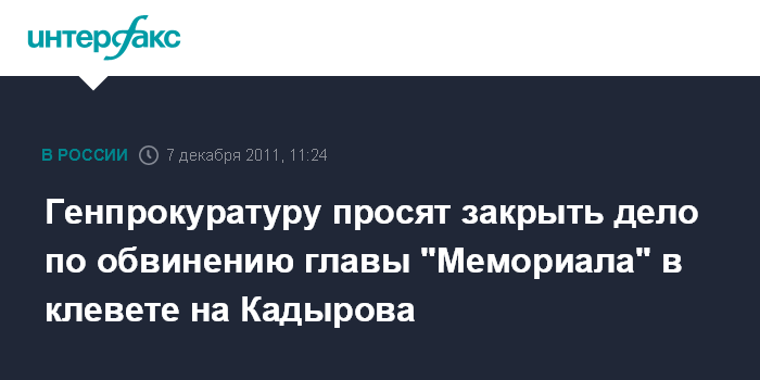 Москва. 7 декабря. INTERFAX.RU - Группа международных и российских правозащитных организаций просит Генпрокуратуру РФ снять с главы центра "Мемориал" Олега Орлова обвинения в клевете на главу Чечни Рамзана Кадырова.