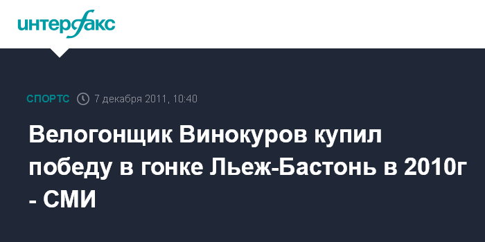 Алматы. 7 декабря. INTERFAX.RU - Швейцарский журнал L'Illustre обвинил известного казахстанского велогонщика Александра Винокурова в покупке победы у российского соперника Александра Колобнева в гонке Льеж-Бастонь в 2010 году.