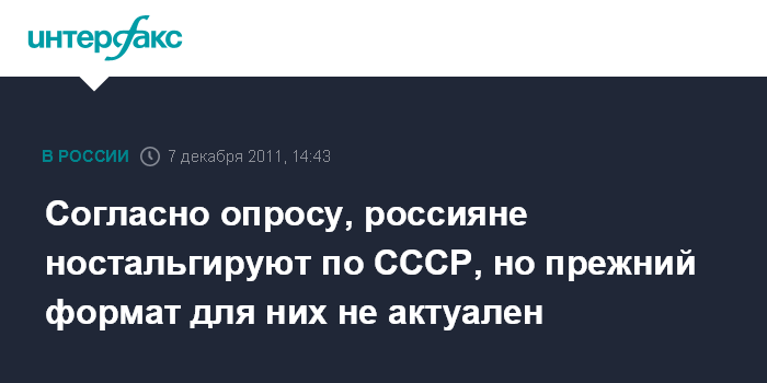 Москва. 7 декабря. INTERFAX.RU - Большинство россиян сохраняет отрицательное восприятие распада бывшего СССР, считая, что его можно было избежать, но восстановление бывшего Советского Союза в прежнем виде предлагают немногие, свидетельствуют исследования социологов.