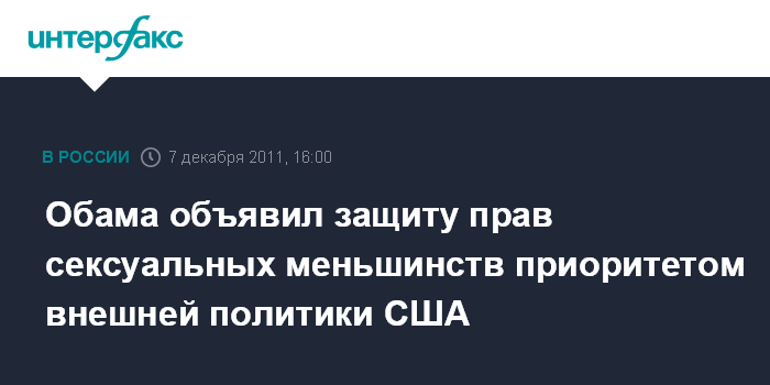 Вашингтон. 7 декабря. INTERFAX.RU - Президент США Барак Обама выпустил директиву, объявляющую борьбу за права сексуальных меньшинств за рубежом приоритетом американской внешней политики.