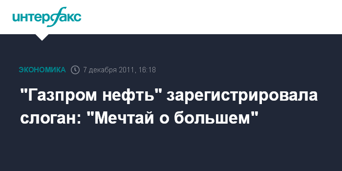 Москва. 7 декабря. INTERFAX.RU - Нефтяная "дочка" "Газпрома" - "Газпром нефть" (РТС: SIBN) - 2 ноября зарегистрировала слоган - "Мечтай о большем", сообщается в базе данных "СПАРК" Интерфакса.