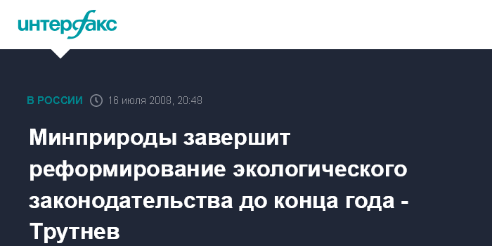 "Ю.Трутнев отметил, что до конца 2008 года Минприроды России планирует завершить реформирование экологического законодательства, призванного создать целостную систему нормирования воздействия на окружающую среду", - говорится в сообщении пресс-службы Минприроды РФ, распространенном в среду.