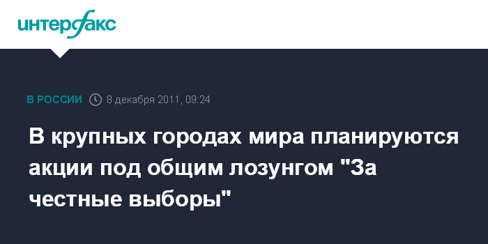 Москва. 8 декабря. INTERFAX.RU – В крупных европейских городах, а также в некоторых городах Канады и Японии, в субботу планируется провести митинги под общим лозунгом "За честные выборы в России".