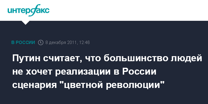 Москва. 8 декабря. INTERFAX.RU - Премьер-министр РФ Владимир Путин заявил, что часть организаторов уличных демонстраций действуют исходя из своих узкокорыстных политических целей, однако большинство граждан страны не хотят развития ситуации по сценарию Киргизии или Украины.
