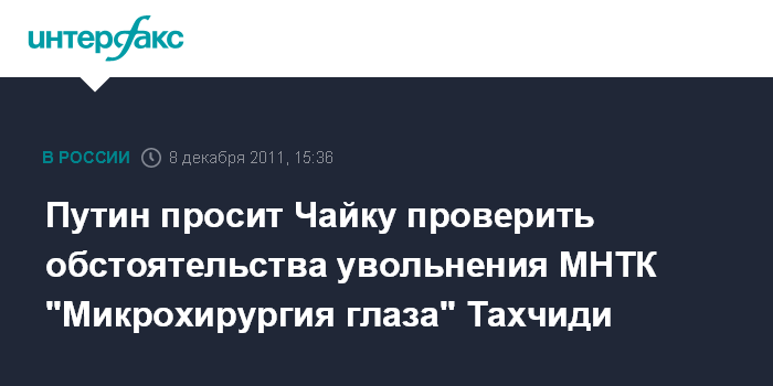 Путин просит Чайку проверить обстоятельства увольнения МНТК "Микрохирургия глаза" Тахчиди
