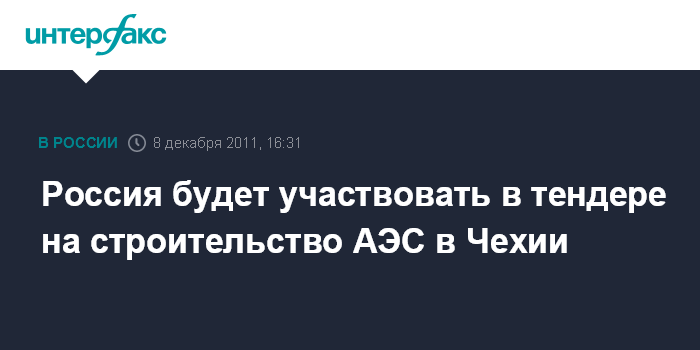 Прага. 8 декабря. INTERFAX.RU - Россия будет участвовать в тендере на строительство АЭС в Чехии, сообщил президент РФ Дмитрий Медведев в Праге после переговоров с чешским коллегой Вацлавом Клаусом.