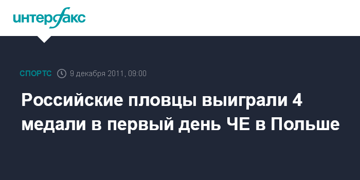 Москва. 9 декабря. INTERFAX.RU - Российские спортсмены выиграли четыре медали в первый день чемпионата Европы по плаванию на короткой воде, который стартовал в польском городе Щенин.