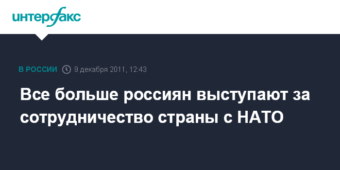 Так, если в 2009 г. больше было тех, кто поддерживал оборонительную политику (39%), то сегодня эту точку зрения разделяет 29% граждан, а большинство (43%) выступают за сотрудничество с НАТО (два года назад - 33%). Такие данные сообщили "Интерфаксу" эксперты ВЦИОМ по результатам всероссийского опроса, отметив, что сегодняшняя позиция общества близка к показателям 2005-2007 годах.