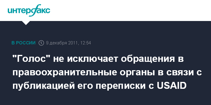 Москва. 9 декабря. INTERFAX.RU - Ассоциация в защиту прав избирателей "Голос" намерена обратиться в правоохранительные органы по поводу публикации переписки членов ассоциации с Агентством США по международному развитию (USAID).