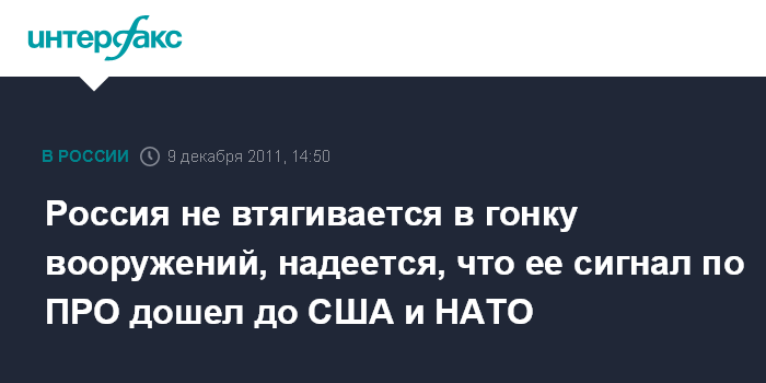 Москва. 9 декабря. INTERFAX.RU - Россия не намерена втягиваться в гонку вооружений, а лишь стимулирует желание США и НАТО договориться с Москвой по ПРО.