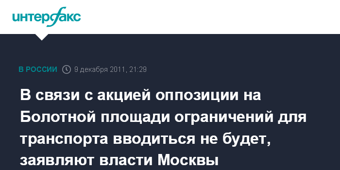 Москва. 9 декабря. INTERFAX.RU - Правительство Москвы не планирует вводить каких-либо ограничений в работе общественного или личного транспорта в связи с запланированным на 10 декабря митингом оппозиции на Болотной площади в центре столицы.