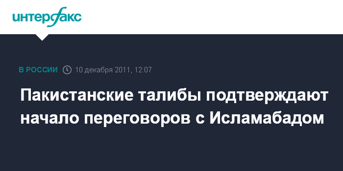 Иерусалим. 10 декабря. INTERFAX.RU - Заместитель командующего пакистанских талибов, которые уже четыре года ведут войну против Исламабада, подтвердил, что они начали переговоры с властями страны, сообщает в субботу израильская газета "Джерузалем пост".