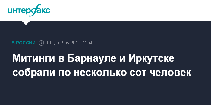 Барнаул/Иркутск. 10 декабря. INTERFAX.RU - В Барнауле (Алтайский край) завершилась четырехчасовая несанкционированная акция протеста против результатов прошедших 4 декабря выборов в Госдуму РФ и Алтайское Заксобрание, передал корреспондент агентства "Интерфакс-Сибирь". Порядка трехсот человек, по данным организаторов акции, в 16:00 по местному времени начали расходиться с площади Советов.