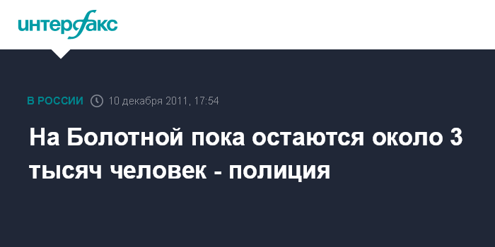Москва. 10 декабря. INTERFAX.RU - Митинг на Болотной площади завершился, на месте пока остается около 3 тыс. человек, сообщили "Интерфаксу" в ГУ МВД России по Москве. "На данный момент, на Болотной площади остались около 3 тыс. человек, в целом обстановка спокойная", - сказали в пресс-службе.