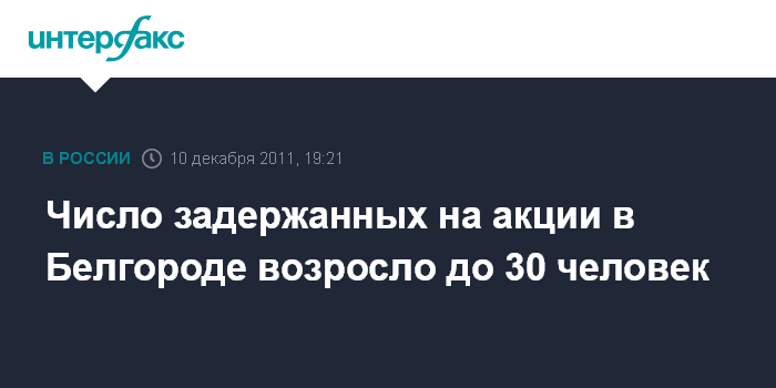 Белгород. 10 декабря. INTERFAX.RU - В Белгороде число задержанных во время несанкционированного митинга против фальсификации выборов в Госдуму РФ, прошедшего в субботу в Парке Победы увеличилось до 30 человек, сообщили "Интерфаксу" в пресс-службе УВД по городу. Ранее сообщалось о 20 задержанных из числа участников мероприятия.