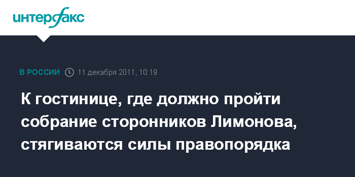 "Мы уже час стоим на улице. Сейчас думаем, что делать. Прибыли шесть автобусов с сотрудниками полиции из оперативного полка. Сказали, что для обеспечения безопасности", - сказал в воскресенье "Интерфаксу" лидер незарегистрированной партии "Другая Россия" Э.Лимонов. "Мы пытались провести переговоры с менеджерами гостиницы и с полицией - бесполезно", - заявил он.