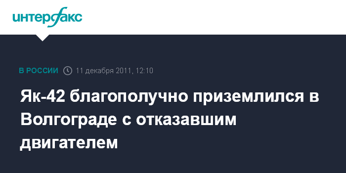 Как сообщил "Интерфаксу" в воскресенье источник в авиадиспетчерских службах Волгоградской области, минувшим днем в аэропорту Волгограда, несмотря на неполадки с одним из двигателей, благополучно приземлился Як-42 с 57 пассажирами на борту. "После вылета из Москвы командир воздушного судна доложил о помпаже левого двигателя. Он принял решение продолжать полет в аэропорт назначения - Волгоград, где в штатном режиме приземлился в 14:14 мск", - отметил собеседник агентства.