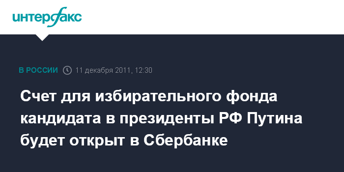 Счет для избирательного фонда кандидата в президенты РФ Путина будет открыт в Сбербанке