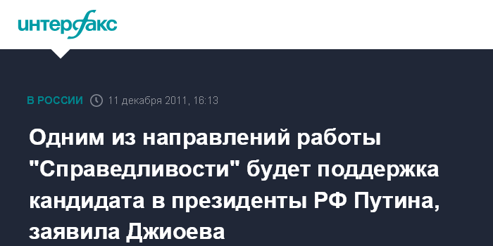 Одним из направлений работы "Справедливости" будет поддержка кандидата в президенты РФ Путина, заявила Джиоева