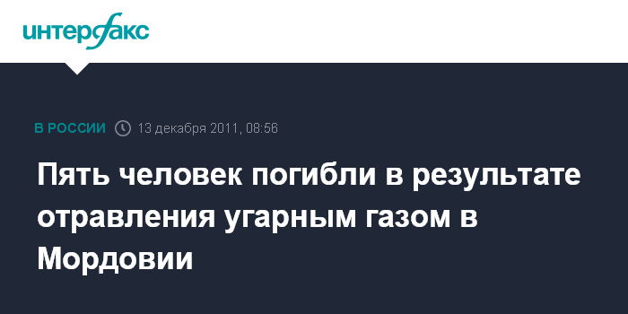 "В селе Кочкурово на улице Ленинской в доме неработавшего с признаками отравления угарным газом обнаружены трупы хозяина и четверых его знакомых мужчин, неработавших. Обстоятельства устанавливаются", - сказал собеседник агентства.