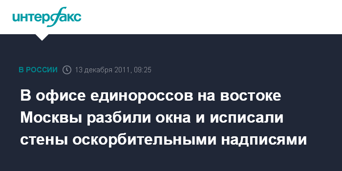 "Накануне в полицию района Новогиреево обратился представитель райисполкома "Единой России", который сообщил, что неизвестные разбили три окна в офисе партии на Зеленом проспекте, д.64, и нанесли черной краской на стене надписи оскорбительного содержания", - сказал собеседник агентства.