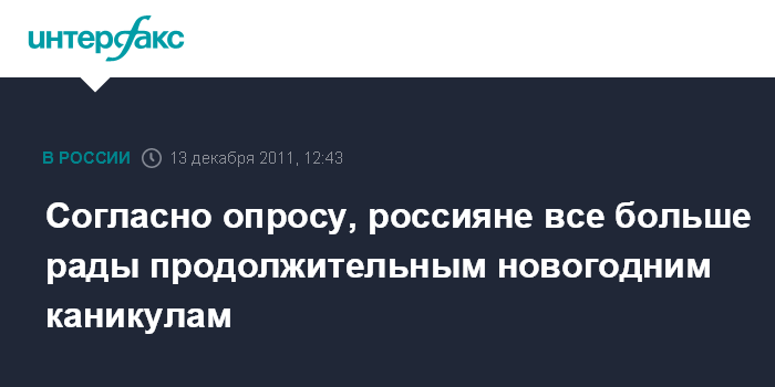 Москва. 13 декабря. INTERFAX.RU - Две трети (65%) россиян, опрошенных порталом Superjob.ru, рады тому, что предстоящие новогодние праздники продлятся достаточно долго - с 31 декабря по 9 января.