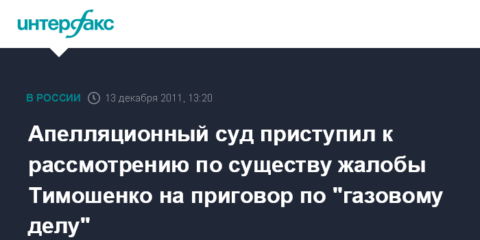 Киев. 13 декабря. INTERFAX.RU - Апелляционный суд Киева во вторник начал рассмотрение по существу апелляции экс-премьера Украины Юлии Тимошенко и ее защиты на приговор Печерского районного суда по "газовому делу", по которому экс-премьер была осуждена на 7 лет лишения свободы.