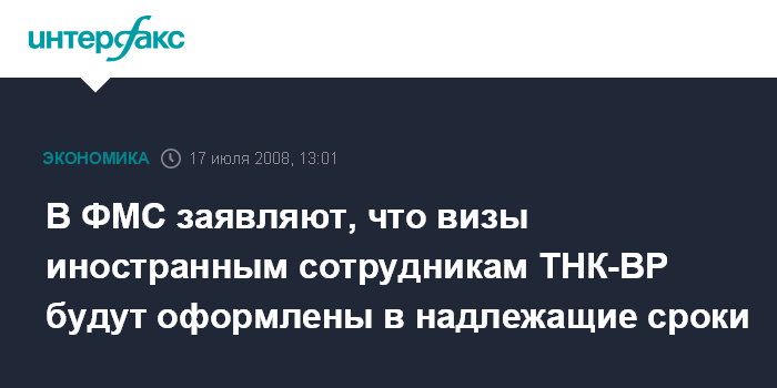Москва. 17 июля. INTERFAX.RU - Федеральная миграционная служба (ФМС) РФ в надлежащие сроки рассмотрит заявки и оформит визы иностранным сотрудникам ТНК-ВР, сообщил заместитель начальника управления службы по Москве Владимир Иванов на пресс-конференции в центральном офисе "Интерфакса".