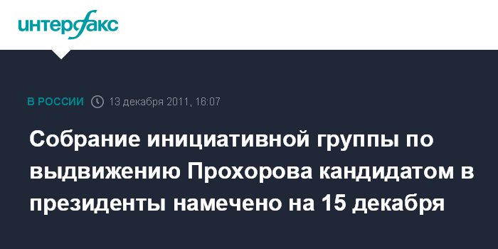 Москва. 13 декабря. INTERFAX.RU - Предприниматель Михаил Прохоров официально уведомил ЦИК России о намерении провести 15 декабря собрание инициативной группы, которая поддержит его самовыдвижение кандидатом в президенты РФ, сообщили в пресс-службе Центризбиркома.