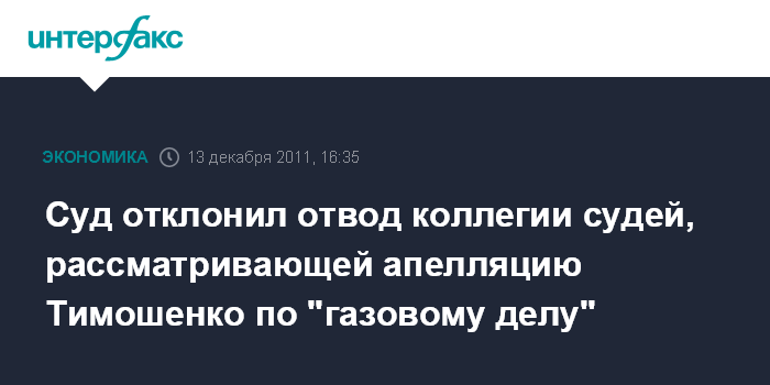 Киев. 13 декабря. INTERFAX.RU - Коллегия судей Апелляционного суда Киева, которая рассматривает жалобу экс-премьера Юлии Тимошенко на приговор по "газовому делу", не приняла свой отвод.