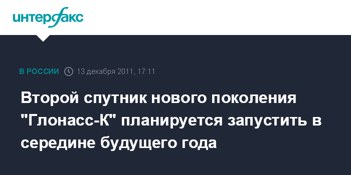 Москва. 13 декабря. INTERFAX.RU - Второй спутник "Глонасс-К" будет запущен к середине следующего года, сообщил генеральный конструктор и генеральный директор ОАО "Информационные спутниковые системы" имени академика Решетнева Николай Тестоедов.
