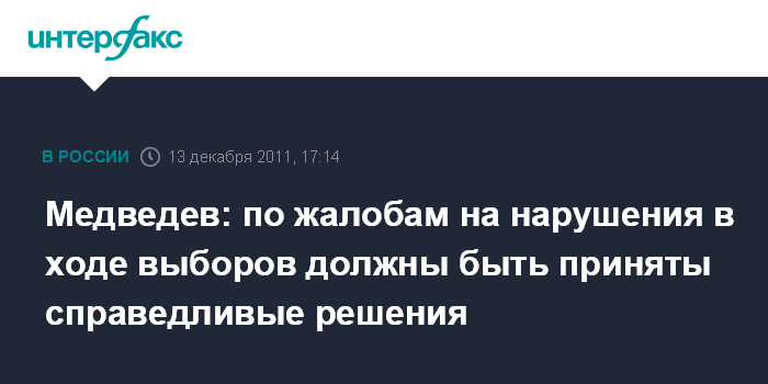 Как сказал Медведев на встрече с лидерами парламентских партий, прошедших в Думу, избирательные комиссии и соответствующие судебные инстанции "обязаны тщательно рассмотреть все жалобы и соответствующие иски, и там, где будут выявлены реальные нарушения, принять справедливые решения".