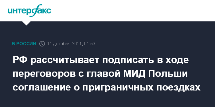 Москва. 14 декабря. ИНТЕРФАКС - Главы МИД России и Польши Сергей Лавров и Радослав Сикорский проведут переговоры в среду в Москве, во время которых подпишут соглашение, позволяющее жителям Калининградской области ездить на территорию Польши без виз.