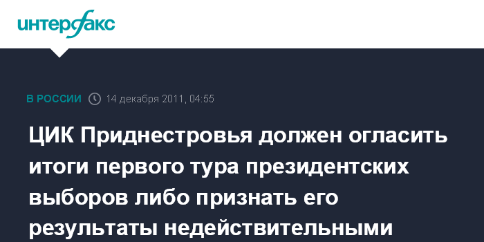 Тирасполь. 14 декабря. ИНТЕРФАКС - Приднестровский Центризбирком в среду должен огласить итоги первого тура голосования на выборах президента непризнанной Приднестровской Молдавской Республики.