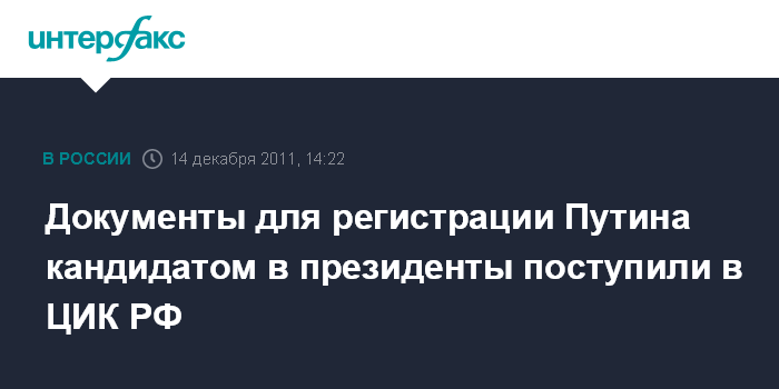 Документы для регистрации Путина кандидатом в президенты поступили в ЦИК РФ