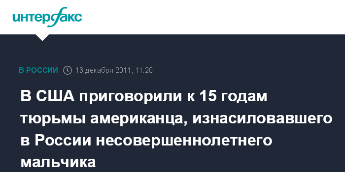 Москва. 16 декабря. INTERFAX.RU - Гражданин США приговорен к 15 годам заключения в этой стране за сексуальное насилие над российским мальчиком в период пребывания американца в России 13 лет назад, сообщил официальный представитель СК РФ Владимир Маркин.