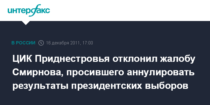 Тирасполь. 16 декабря. INTERFAX.RU - ЦИК непризнанной Приднестровской республики в пятницу отказался удовлетворить жалобу действующего руководителя Приднестровья Игоря Смирнова, который просил признать недействительными итоги первого тура президентских выборов.