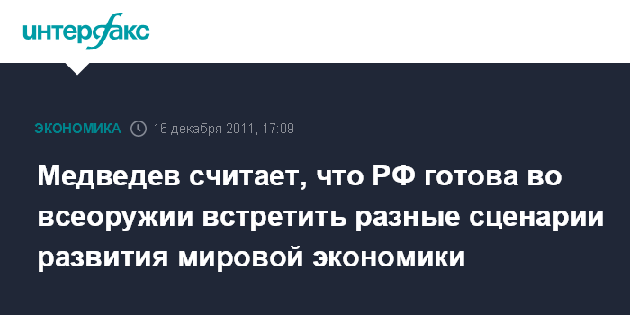 Москва .16 декабря. INTERFAX.RU - Россия должна быть готова к самым разным сценариям развития экономической ситуации в мире, заявил президент РФ Дмитрий Медведев.
