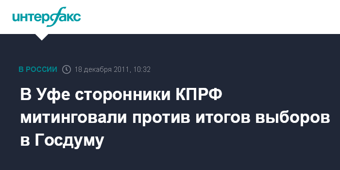 Уфа. 18 декабря. INTERFAX.RU - Башкирские коммунисты провели в воскресенье в Уфе митинг против "массовых фальсификаций" 4 декабря на выборах в Госдуму. Несмотря на мороз минус 15 градусов, на площади перед Русским драматическим театром собрались, по данным организаторов, 250 человек. По данным полиции, на мероприятии присутствовало до 50 человек, в основном люди среднего и пожилого возраста.