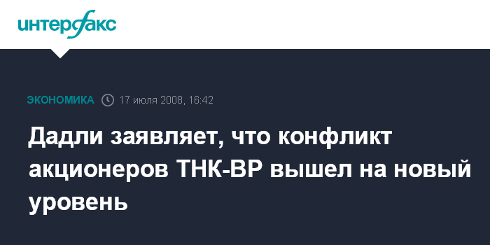 Москва. 17 июля. INTERFAX.RU - Конфликт акционеров топливной компании ТНК-ВР вышел на новый уровень, заявил журналистам глава компании Роберт Дадли.