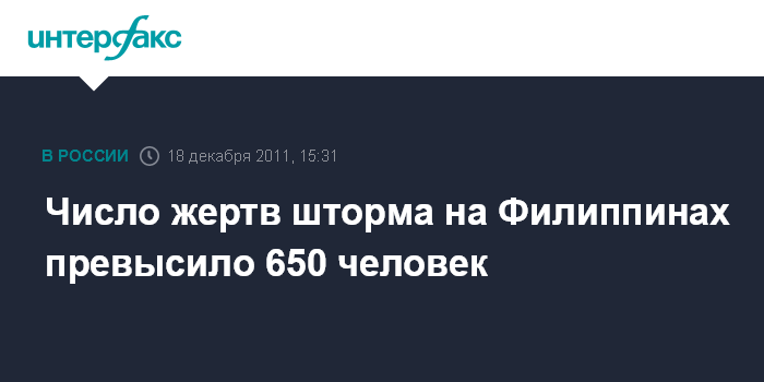 Женева. 18 декабря. INTERFAX.RU - Обрушившийся на Филиппины тропический шторм "Ваши" унес жизни не менее 652 человек, 808 считаются пропавшими без вести, сообщает в воскресенье Красный Крест. По последним сведениям, в результате удара стихии пострадали 106,476 тыс. человек. Из них 34,911 тыс. находятся во временных убежищах. По неофициальным данным, десятки тысяч филиппинцев, оставшихся без крова, еще не добрались до временных убежищ.