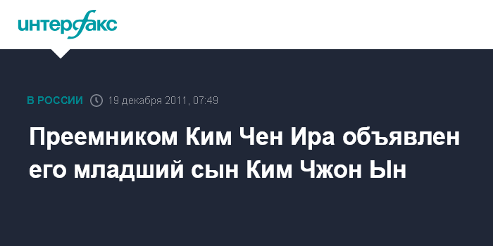 Москва. 19 декабря. ИНТЕРФАКС - Место Ким Чен Ира во главе Северной Кореи займет его младший сын Ким Чжон Ын, передает Первый канал.