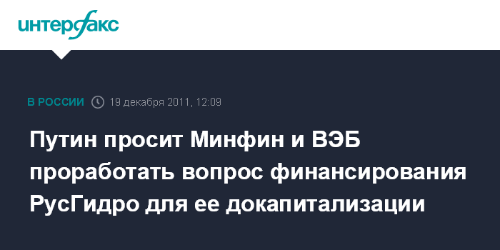 Черемушки (Хакасия). 19 декабря. INTERFAX.RU - Премьер-министр РФ Владимир Путин просит Минфин и ВЭБ проработать вопрос финансирования ОАО "РусГидро" с целью ее докапитализации.