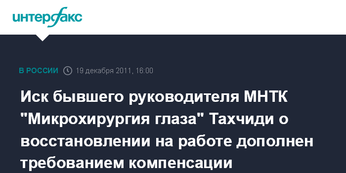 Иск бывшего руководителя МНТК "Микрохирургия глаза" Тахчиди о восстановлении на работе дополнен требованием компенсации