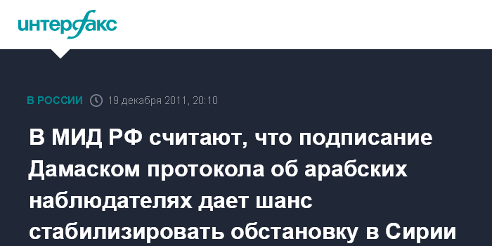 Москва. 19 декабря. INTERFAX.RU - В России полагают, что подписанный сирийскими властями протокол о направлении в страну арабских наблюдателей позволит задействовать механизм независимого контроля ситуации в стране и стабилизировать обстановку.