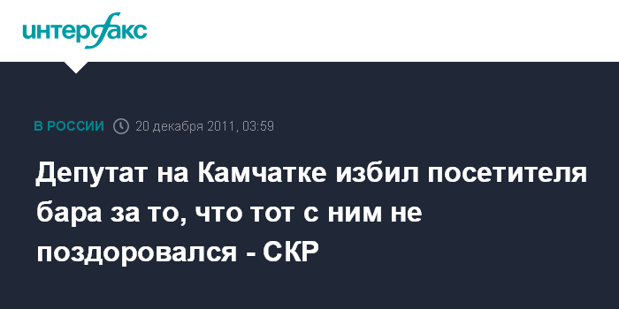 Петропавловск-Камчатский. 20 декабря. ИНТЕРФАКС-ДАЛЬНИЙ ВОСТОК - Следственные органы на Камчатке возбудили уголовное дело в отношении 27-летнего депутата Собрания депутатов Елизовского городского поселения, которого подозревают, в том, что он с приятелями избил знакомого, отказавшегося поздороваться с их компанией.
