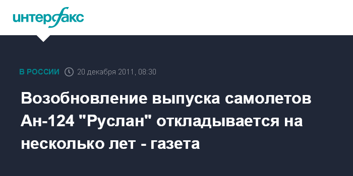 Москва. 20 декабря. INTERFAX.RU - Возобновление производства крупнейших в мире серийных транспортных самолетов Ан-124 "Руслан" произойдет нескоро, пишут "Известия" во вторник.