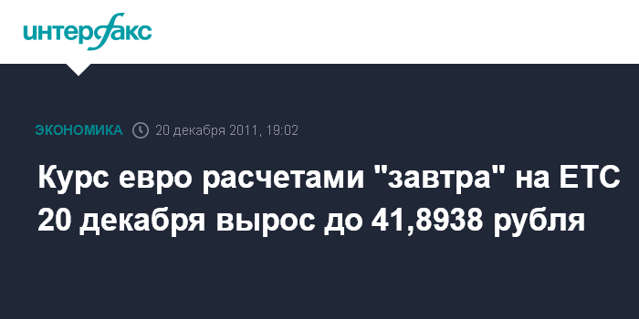 Москва. 20 декабря. INTERFAX.RU - Средневзвешенный курс евро расчетами "завтра" на единой торговой сессии (ЕТС) ММВБ во вторник вырос на 18,48 коп. по сравнению с результатом предыдущих торгов и составил 41,8938 рубля.