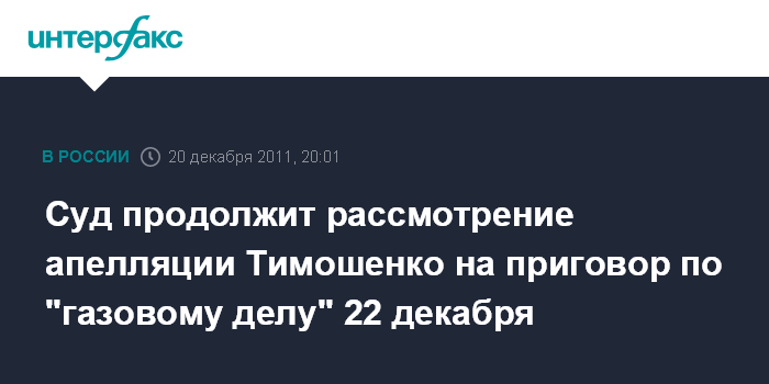 Киев. 20 декабря. INTERFAX.RU - Апелляционный суд Киева продолжит рассмотрение апелляции на приговор по "газовому делу" экс-премьера Юлии Тимошенко 22 декабря в 10.00.